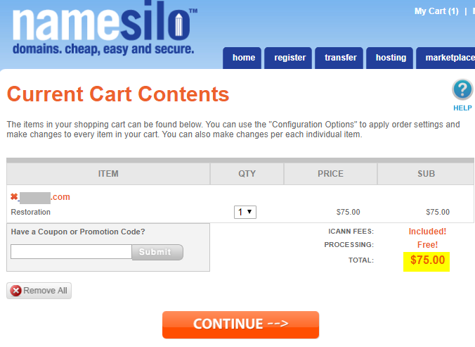 네임실로에서 30일 지난 후 복구기간에 .com 의 복구비용은 $75 이다.
