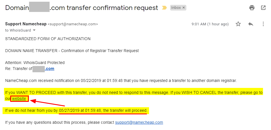 Namecheap.com received notification on 05/22/2019 at 01:59:48 that you have requested a transfer to another domain registrar.