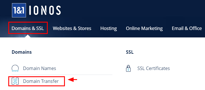 1. DOMAINS & SSL 메뉴 - DOMAIN TRANSFER 를 선택