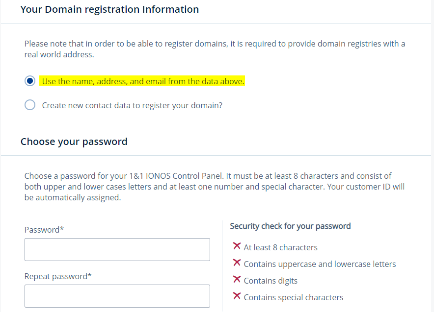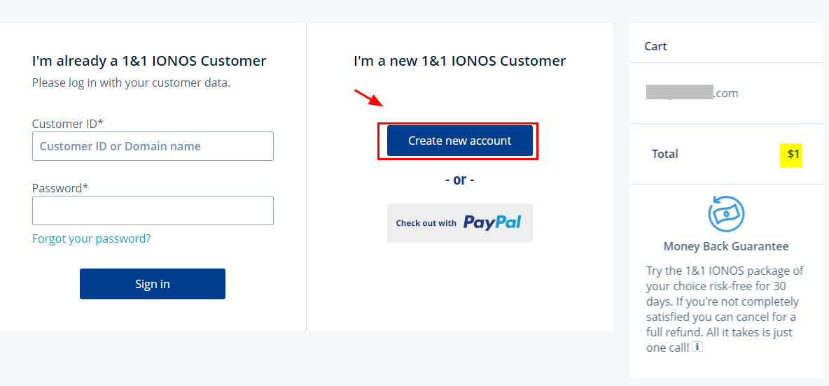 8. 1&1 IONOS 회원이면 로그인하고, 신규 가입을 하였다.
