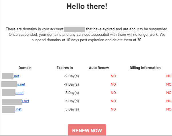 There are domains in your account (downisnow) that have expired and are about to be suspended. Once suspended, your domains and any services associated with them will no longer work. We suspend domains at 10 days past expiration and delete them at 30.
